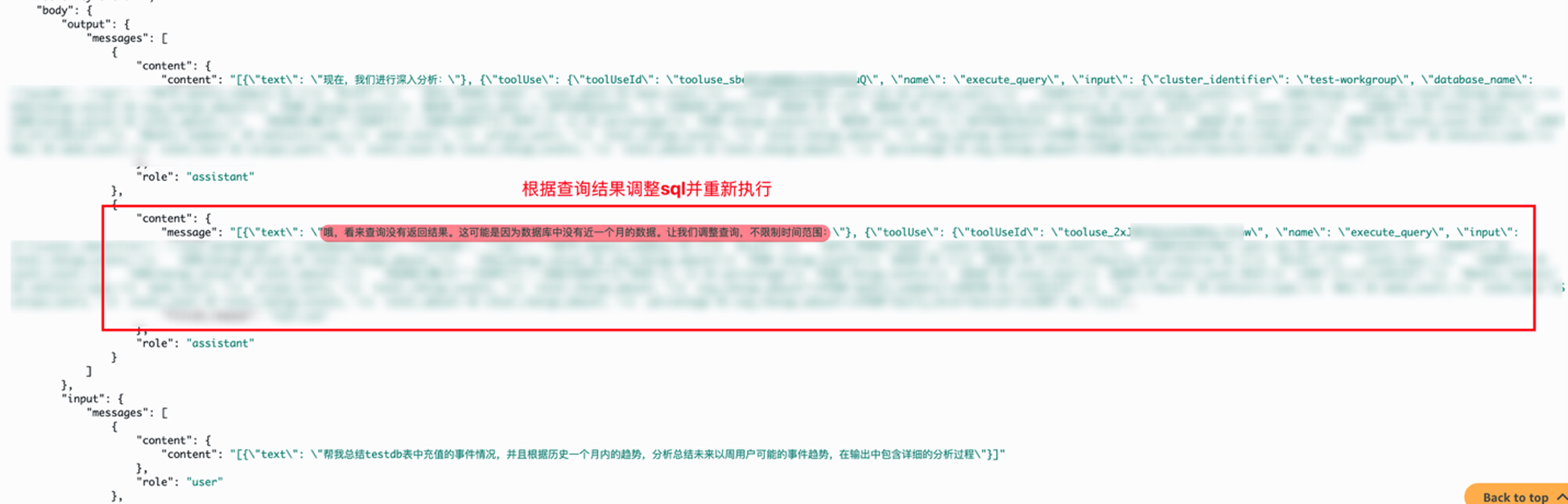 大语言模型根据上述输出内容完成text2sql生成对应的sql语句,并调用execute_query工具执行,在执行过程中会根据返回的结果调整sql语句直到输出符合预期。