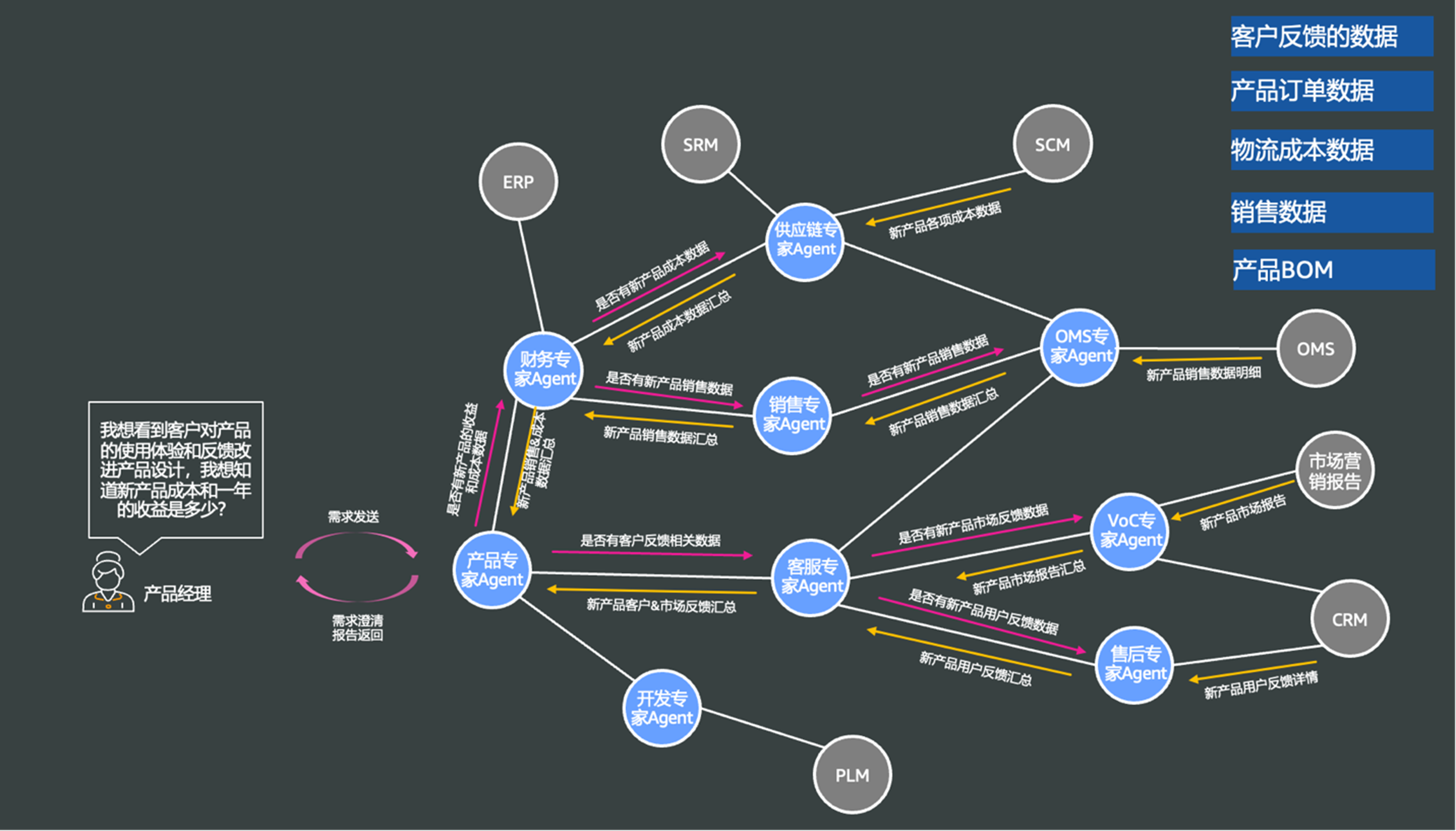 在这一模式下,不同业务领域会有专门的Agent负责处理该领域内的数据请求。例如,当产品经理需要了解”客户对产品的使用体验和新产品成本与收益”时,系统会自动协调产品专家Agent、财务专家Agent、客服专家Agent等多个角色,从SCM、OMS、CRM等系统获取所需数据,最终生成完整报告,整个过程无需人工协调多个部门。