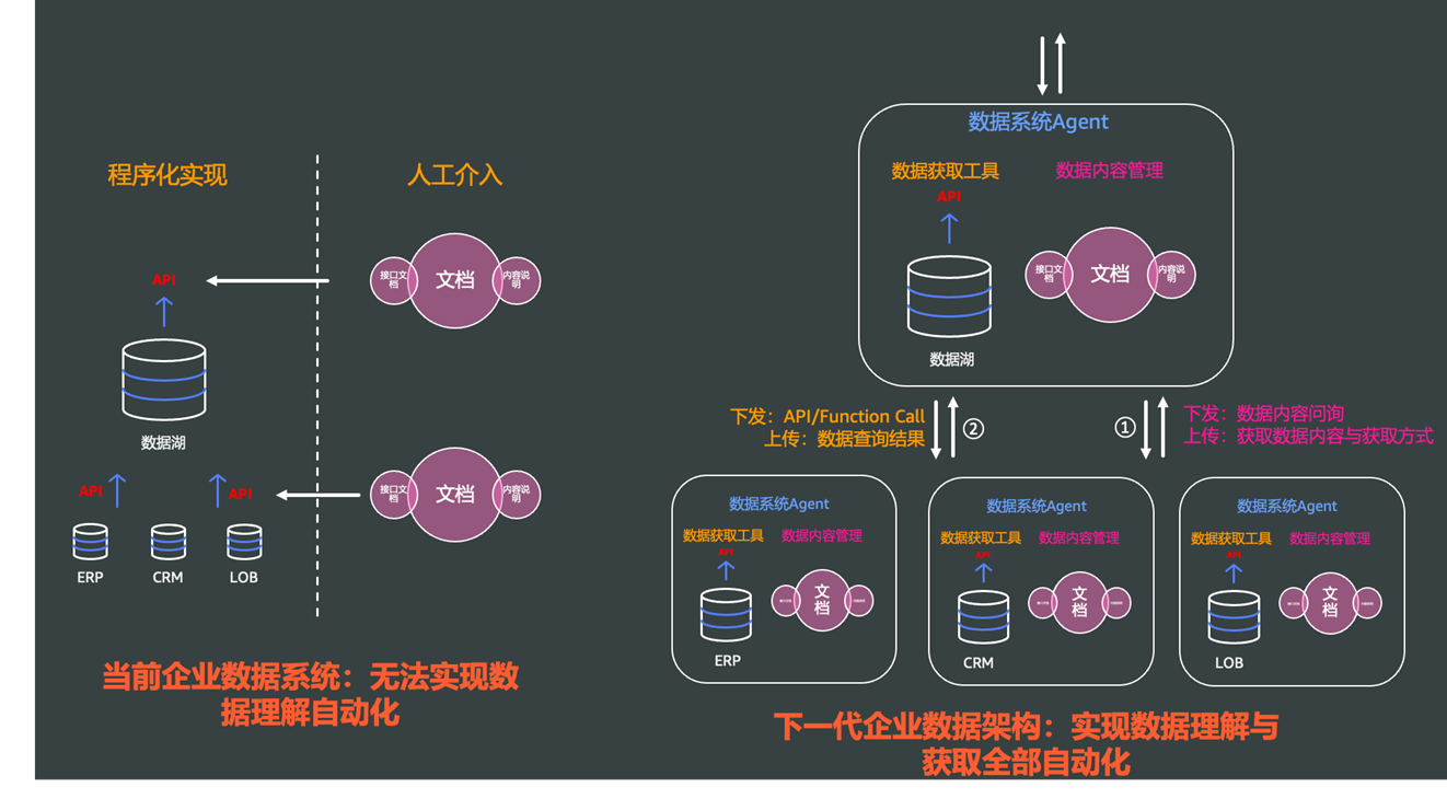 相对传统系统的突破性创新。传统企业数据系统(左侧)存在”程序化实现”和”人工介入”的割裂状态,例如在ERP、CRM和LOB系统形成独立孤岛,数据难以自动化流通。而智能外围架构(右侧)通过数据系统Agent统一协调,实现了各业务领域Agent(如ERP Agent、CRM Agent、LOB Agent)的智能连接。每个业务领域Agent都配备专属数据获取工具和内容管理系统,通过上下行数据流实现整体协同。