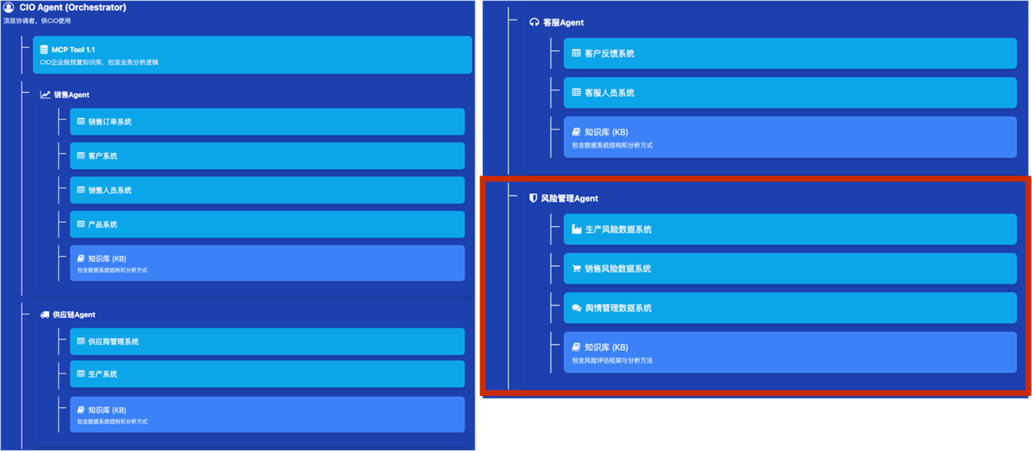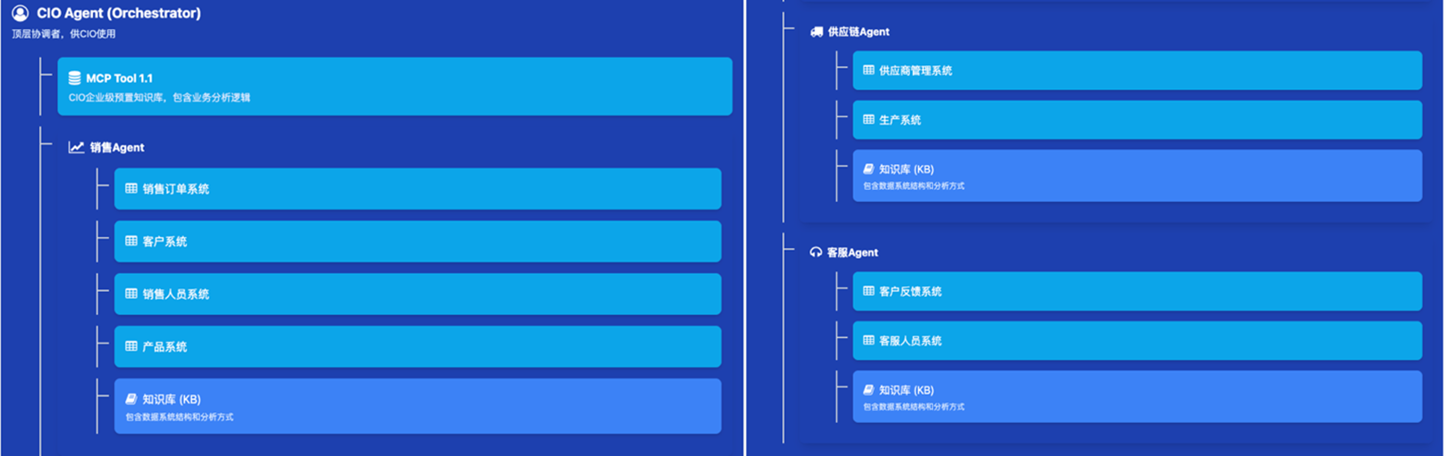 - 知识库(KB):包含企业宏观战略、部门协作规则、数据治理政策及业务流程图谱