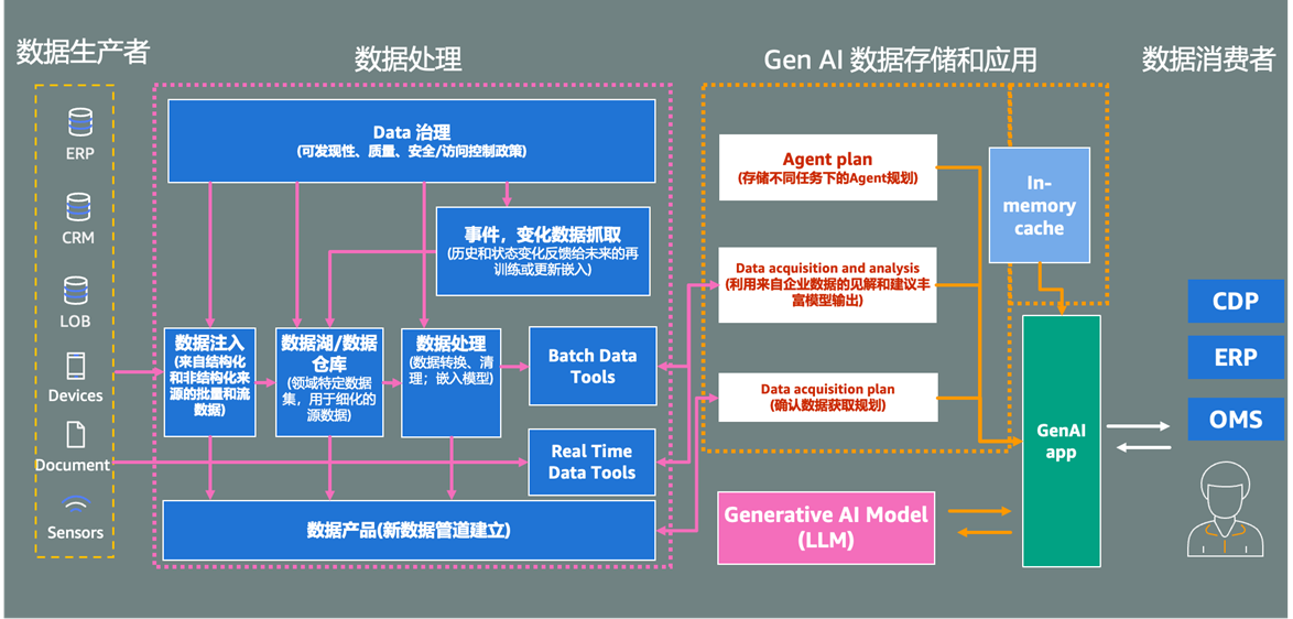 需求驱动下持久化数据管道的构建过程:从右侧数据消费者出发,业务用户通过GenAI应用界面提出数据需求,触发中右部分的GenAI存储与应用层响应。在这一层,Agent计划系统智能分析请求、制定数据获取方案并协调执行;生成式AI模型(LLM)提供语义理解能力;数据获取与分析模块规划具体执行路径。这些智能组件不仅满足当前请求,更会建立起持久化数据管道 – 将一次性请求转化为可重复使用的数据流程。请求传递至中部数据处理中枢,这里的”Data治理”模块确保数据质量与一致性,而底层的”数据产品(领域知识管理)”则将临时数据需求转化为持久化数据产品,定义标准化的数据结构、处理逻辑和访问接口。系统根据需要调用批处理或实时处理工具,建立从左侧数据生产者(ERP、CRM、LOB等系统)到最终用户的端到端数据管道。这种方式使每个业务请求不只是一次性查询,而是促成可持续利用的数据资产的形成,实现了从”重复建设”到”积累沉淀”的数据能力提升模式。
