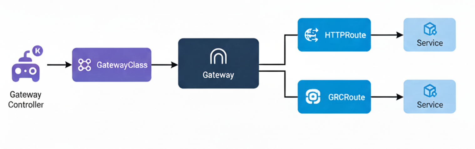 - GRPCRoute: 用于定义 gRPC 流量的路由规则,将来自 Gateway 的流量映射到后端 Pod