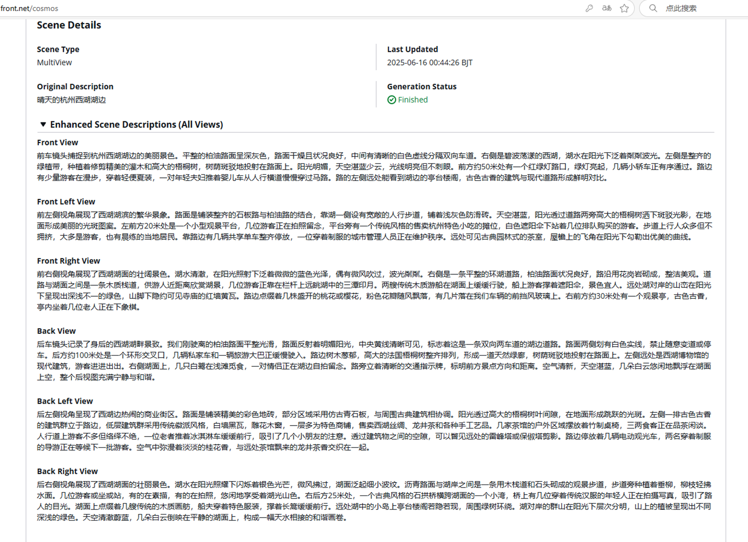 针对危险场景复现难、传统仿真效率低的痛点,AD Insight Hub 结合基于NVIDIA Cosmos ,用户通过 AD Insight Hub 前端输入场景描述(如“晴天的杭州西湖湖边”),然后Amazon Bedrock 中的大模型将简单描述优化为细节丰富的提示词,最后借助NVIDIA Cosmos世界模型,生成符合真实物理规律的场景视频。