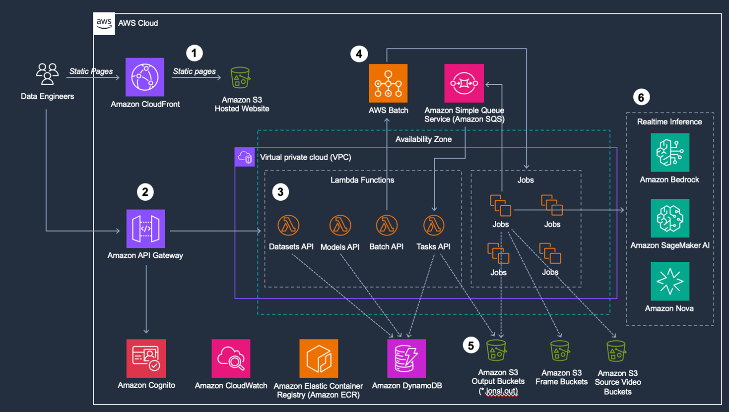 6、实时推理服务层:实时推理层由三个强大的AI服务组成:Amazon Bedrock提供多模态大模型能力,支持自然语言处理和视觉理解;Amazon SageMaker AI提供完整的机器学习模型开发和部署环境, 可以支持Cosmos等相关模型的部属与管理;Amazon Nova提供高性能计算能力。这些服务共同支持Bounding Box自动标注、场景智能标注、语义搜索和仿真视频生成等核心功能。