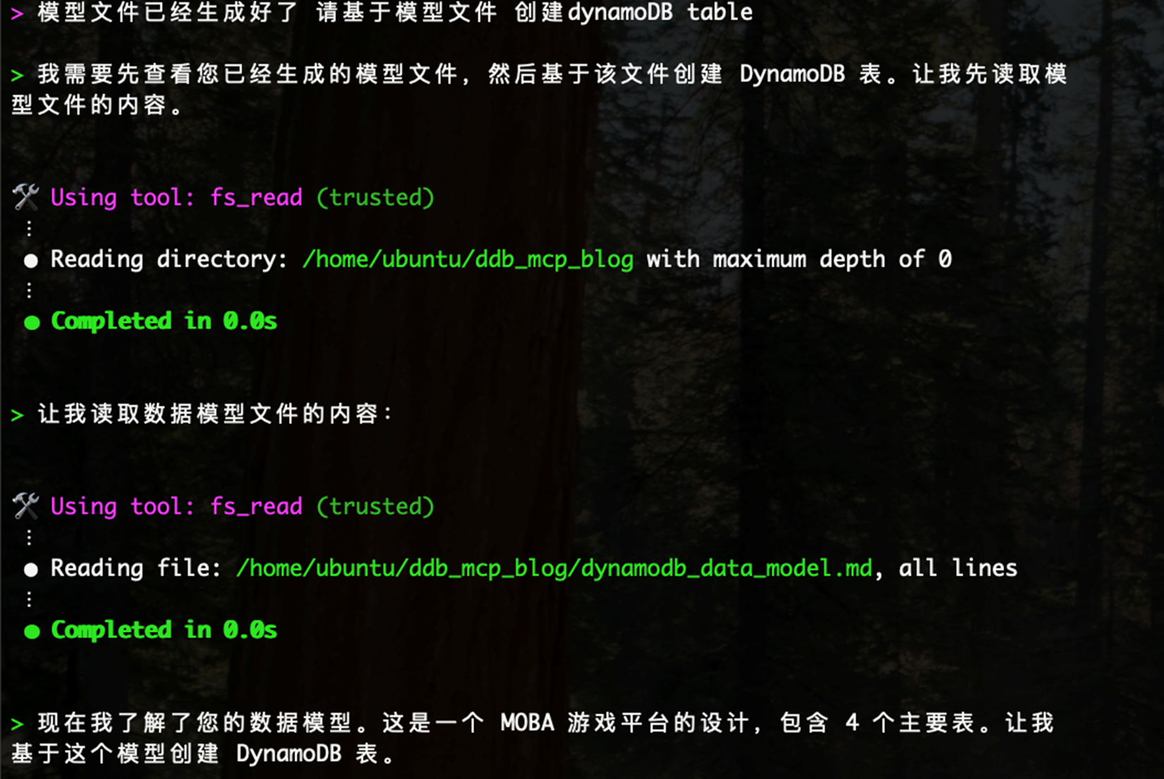 以 ddb_mcp_blog 目录作为工作目录,从该路径启动 Q CLI 对话窗口,输入提示词: