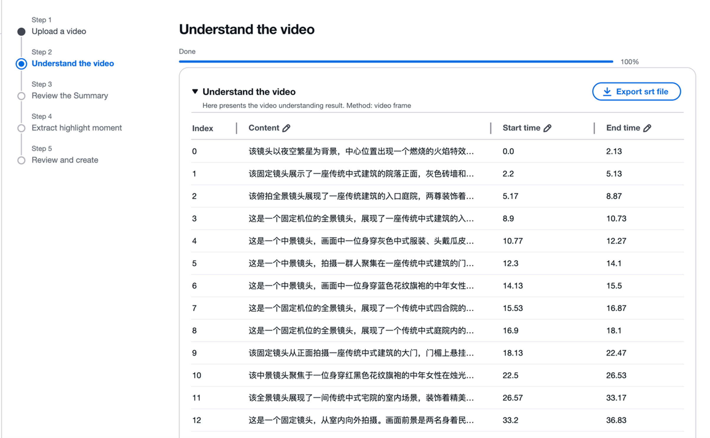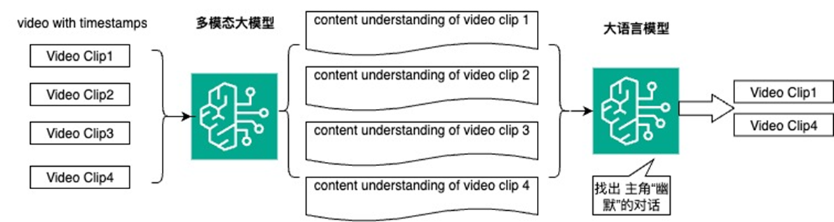 - 而对于需深度画面分析的场景(如识别无声视频中的动作逻辑、复杂场景细节),则直接调用支持视频输入的大语言模型,将视频片段作为输入,让模型生成结构化的画面描述,为后续智能剪辑提供精准的内容参考,确保各类素材都能被有效解析。