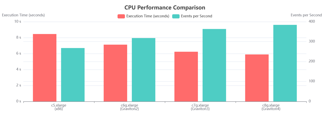 | 实例类型 | CPU架构 | 执行时间 (秒) | 每秒事件数 | 性能比较(相较于 c5.xlarge) | |