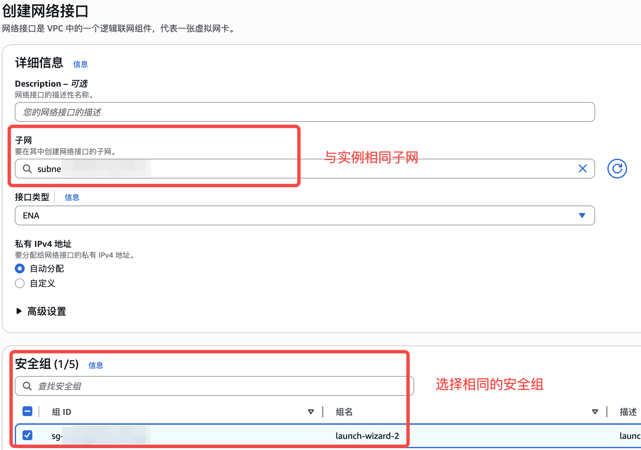 控制台中启动EC2完成后,再在控制台新建一个网络接口(ENI),注意子网选择和已启动的EC2一致,同时选择相同的安全组。此时实例上应该有两个网络接口,一个用于正常网络连接,另一个用于DPDK。