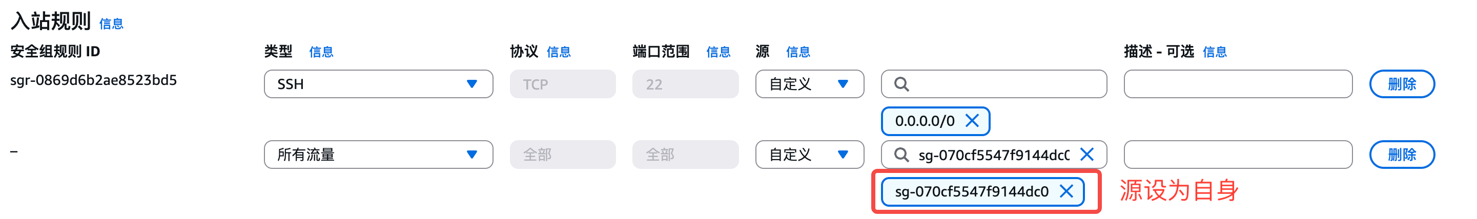 创建完成后,在新创建的安全组中添加一条新的入站规则,允许所有流量,允许源设置为安全组自身(方便后续测试)。