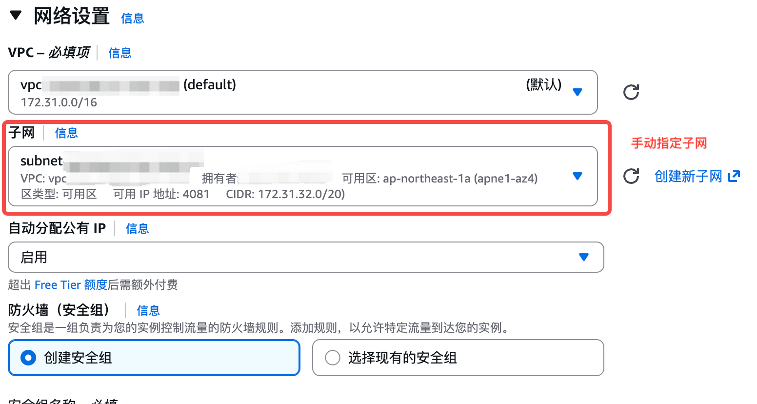 首先创建一台新的EC2,网络设置里指定特定子网(固定AZ),同时创建一个新的安全组。