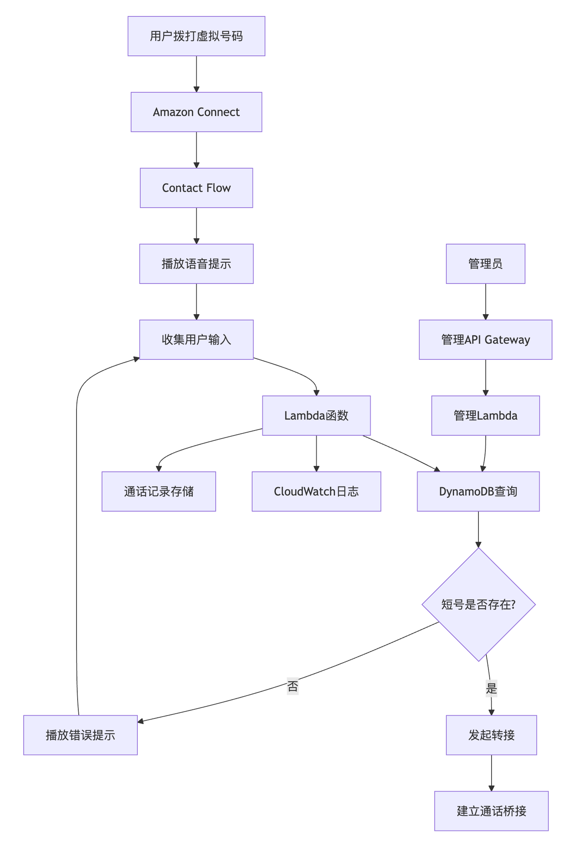 - 指定号码呼叫+输入短号(分机号)。指定号码是正常普通号码。当呼叫指定号码后,会自动接通并收到输入短号/分机号的提示,输入短号后再转接到真实的号码。这种方式只需要少量的普通号码,通过生成不同的短号关联到不同的真实号码,能够持久的使用或根据需求自定义任意的有效时间。