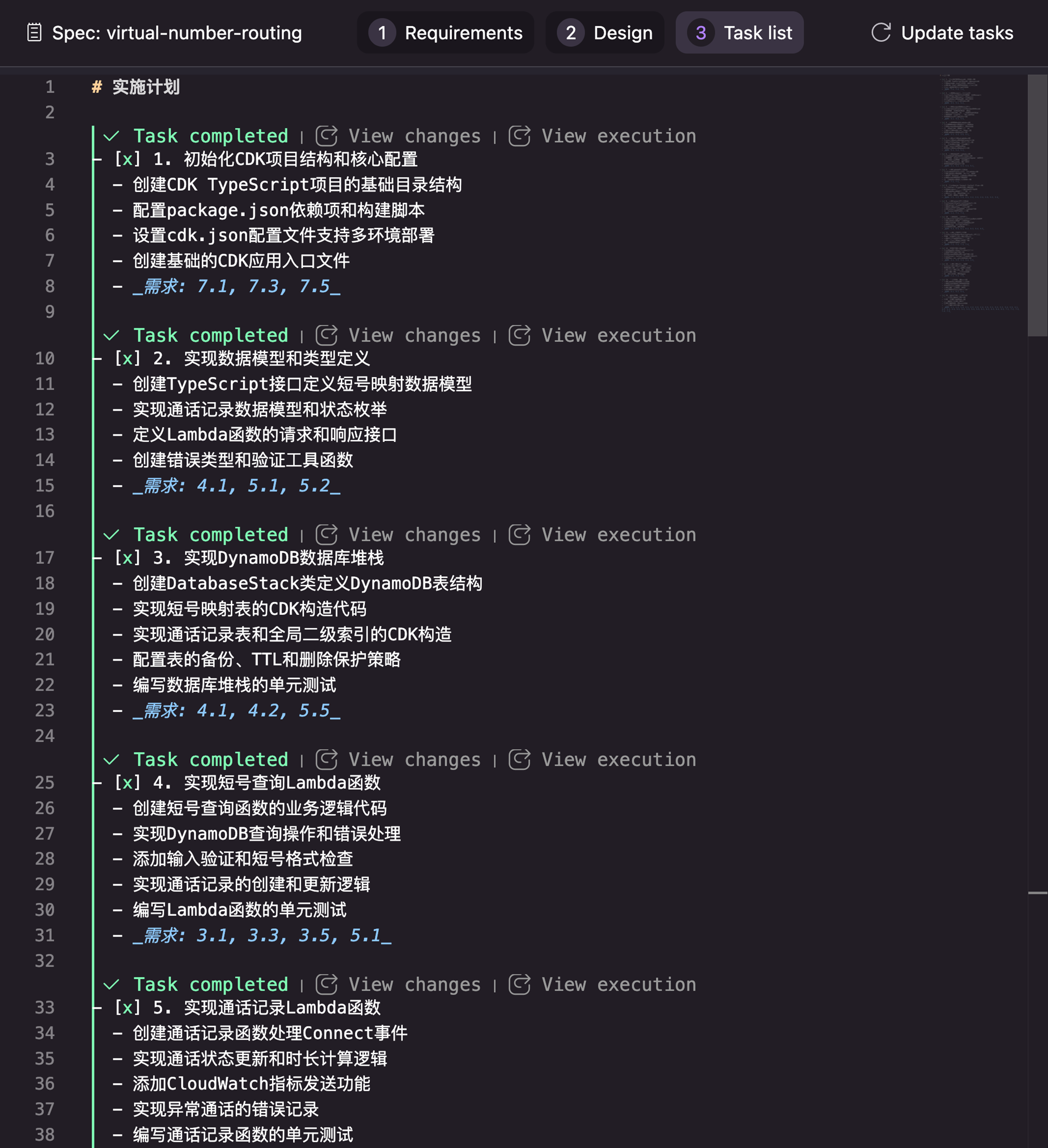 在生成初始Design设计文档后,我添加了一个“支持CDK部署”需求,Kiro更新了需求文档和设计文档,之后转到实施计划阶段,生成开发任务