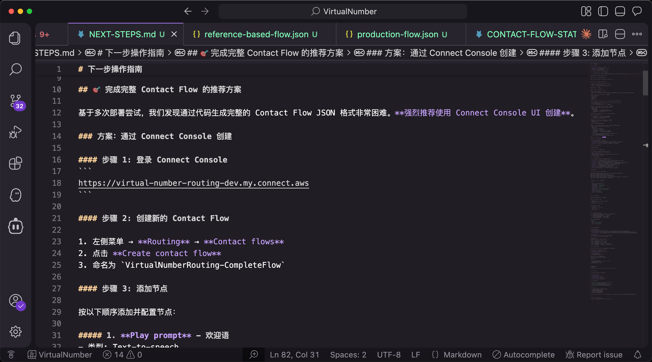 - 对于Amazon Connect Contact Flow这一类格式复杂,对专业性要求比较高的配置文件,对LLM来说很有挑战。在本项目中,Kiro在尝试多次失败后,提议到Connect控制台UI手动创建IVR流,不过它提供了详细的配置步骤和节点类型配置,并说明了如何导出IVR流配置文件到CDK项目中,方便后续直接部署。