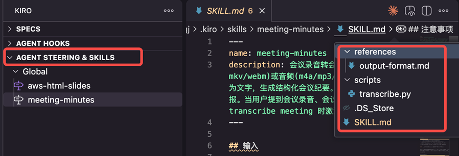 - description 要精准:Kiro 用 description 判断何时激活 Skill。写上”会议录音、会议纪要、转录、transcribe meeting”这些关键词,确保用户用中文或英文提问都能触发。
