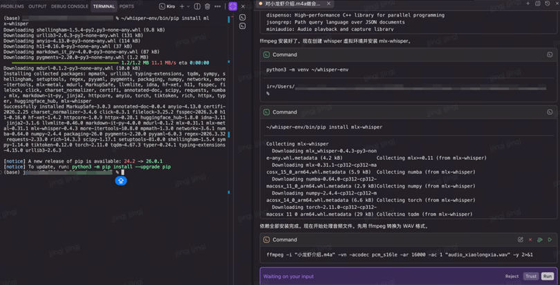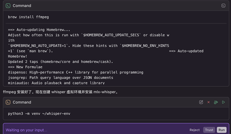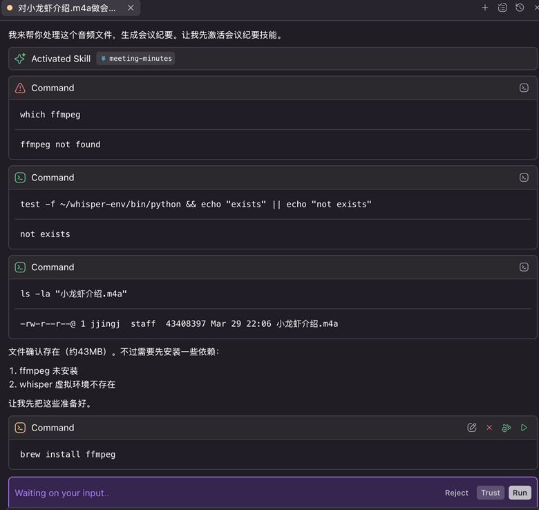 Skill首先会检查环境里是否已经安装依赖组件(ffmpeg 和mlx-whisper),如果没有则会请求安装。用户同意后,便会自动安装。