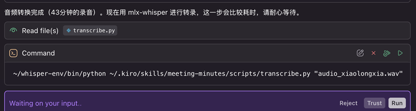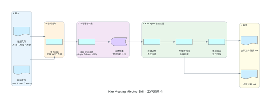 Kiro 会自动匹配到 meeting-minutes Skill 并激活,然后按照 SKILL.md 中定义的六个步骤依次执行。整个过程无需手动干预,最终在录音文件同目录下生成 会议纪要_<主题>.md。
