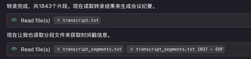 脚本输出两个文件:transcript.txt(完整文本)和 transcript_segments.txt(带时间戳的分段文本)。分段文本对后续的会议纪要生成很重要——Agent 可以根据时间戳判断话题切换点。