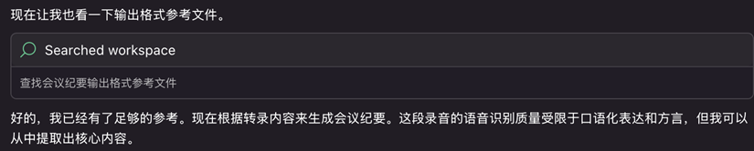会议纪要的格式会按照 ~/meeting-minutes/references/output-format.md 的格式进行输出。语音中模糊或理解错误的转录也会被模型在这一步中进行纠正。