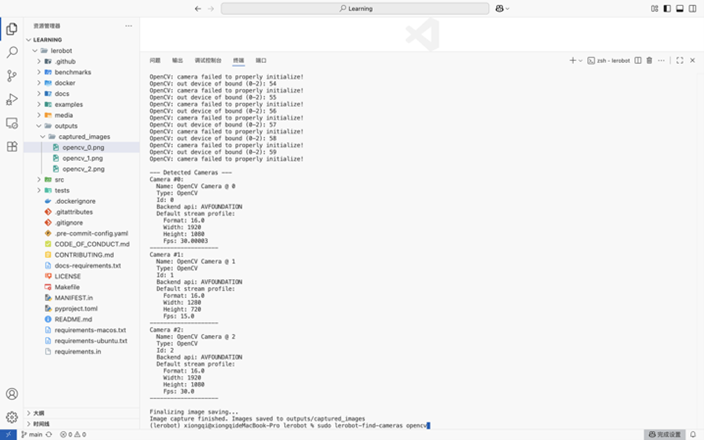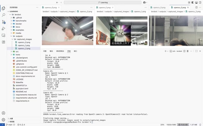 启用命令后,会显示出三个摄像头设备(免驱外部摄像头、Macbook摄像头、iPhone连续互通摄像头),拍摄的图片会按照摄像头的ID保存在outputs文件夹中,可以通过这个文件夹里面摄像头拍摄的图片来判断当前位置是否有问题,但是要注意不要将两个同款的摄像头连接在一个USB-HUB上,这样在采集数据的时候会出现摄像头识别问题。