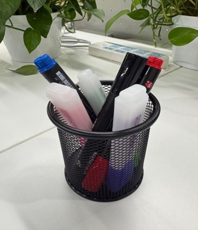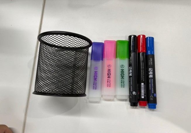 然后是任务方面,围绕笔和笔筒,定义了一个比较常见的任务,使用机械臂来对桌面上杂乱摆放的马克笔进行整理,将其放置到笔筒中,使用到的物品资产如下: