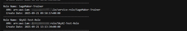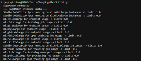 使用以下代码来测试IAM账户权限是否可用,同时获取当前账号下可使用的训练资源配额,出现以下输出即代表与SageMaker的连接是正常的: