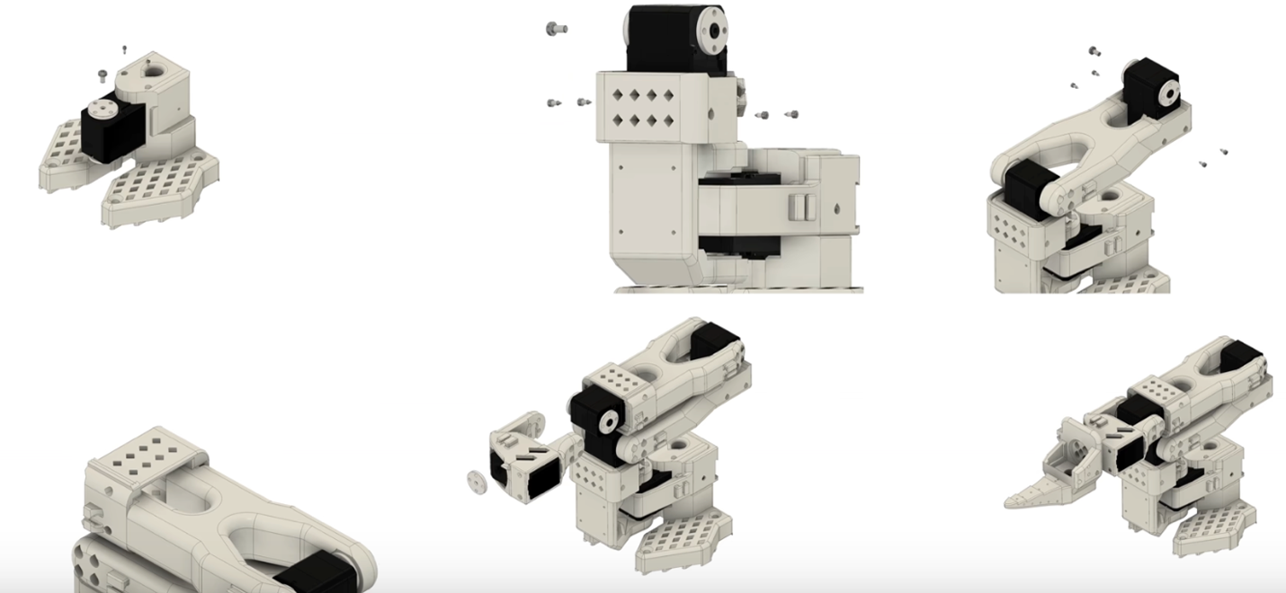 接下来便可以按照官方提供的如下3D演示动画安装Follower和Leader了,下面是关节一到关节五以及夹爪的安装实例,除了夹爪之外,前面五个关节的安装方法均一致,仅需注意Leader臂的电机型号: