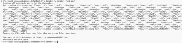 在完成机械臂的安装后,可以开始对机械臂两个臂的电机进行配置并设置其对应的ID了,新版的LeRobot提供了CLI命令可以直接运行对应的命令。首先将两个机械臂的串口线全部接上电脑并运行如下命令,接着按照提示拔出其中一个串口线按下回车即可知道拔出的串口号是多少(实际就是记录插上的所有串口,然后再和拔出后的进行对比就可以知道哪个串口少了…),示例输出如下图: