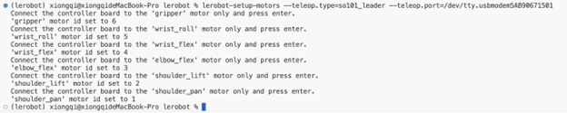由于LeRobot使用的是总线舵机,每个电机都通过总线上的唯一 ID 进行识别,而全新电机通常带有一个默认 ID 为 ’1’,所以为了让电机和控制器之间正常通信,需要为每个电机设置一个唯一的且不同的 ID,在确定了自己的两个机械臂分别对应的串口后便可以一个臂一个臂一个电机一个电机的进行配置,在新版的LeRobot库不需要重复多次运行电机配置命令,只需要运行以下命令并依次将不同的舵机线插到控制板按回车即可,具体可以参考这个视频。