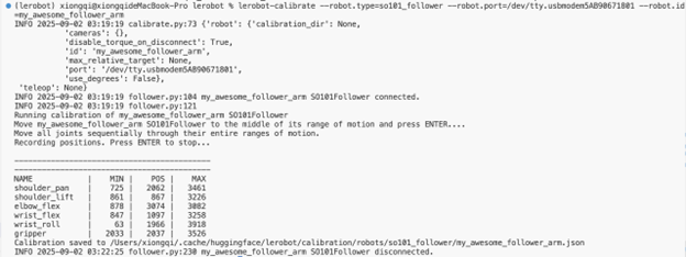 在完成机械臂电机的配置之后,可以对机械臂进行校准。这部分主要是为了确保主动机臂和从动机臂在处于相同物理位置时具有相同的位置值,也就是可以操控Leader来控制Follower臂进行数据采集,旧版的LeRobot需要在运行命令之后将所有臂摆成三个不同的姿势来校准,如果校准的姿势有细微的区别,就会影响两个机械臂之间的映射。新版的LeRobot采用了新的控制方式,只需要在所有舵机处于机械臂运动的中值时开启校准然后依次扭动舵机使系统自动记录舵机当前可运动的最大最小值即可自动完成校准,具体命令如下,及参考视频链接。