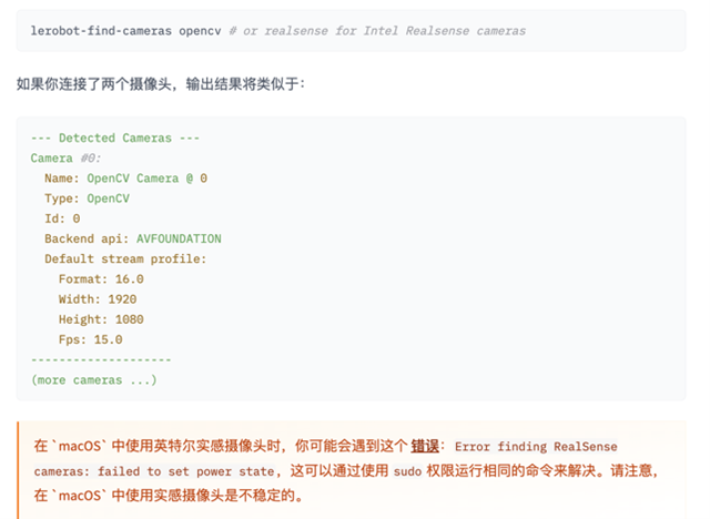 LeRobot 提供多种视频捕捉选项,包括手机摄像头、内置笔记本电脑摄像头、外部网络摄像头等,可以随意选择使用的摄像头以及摄像头的放置位置。首先可以运行以下的命令来查找并测试当前设备连接的摄像头ID及参数: