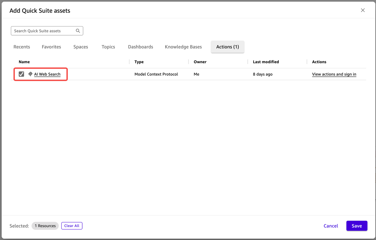 - 统一的用户体验:用户无需在多个工具间切换,在 Quick Suite 的 Chat Agent 中即可完成所有搜索需求