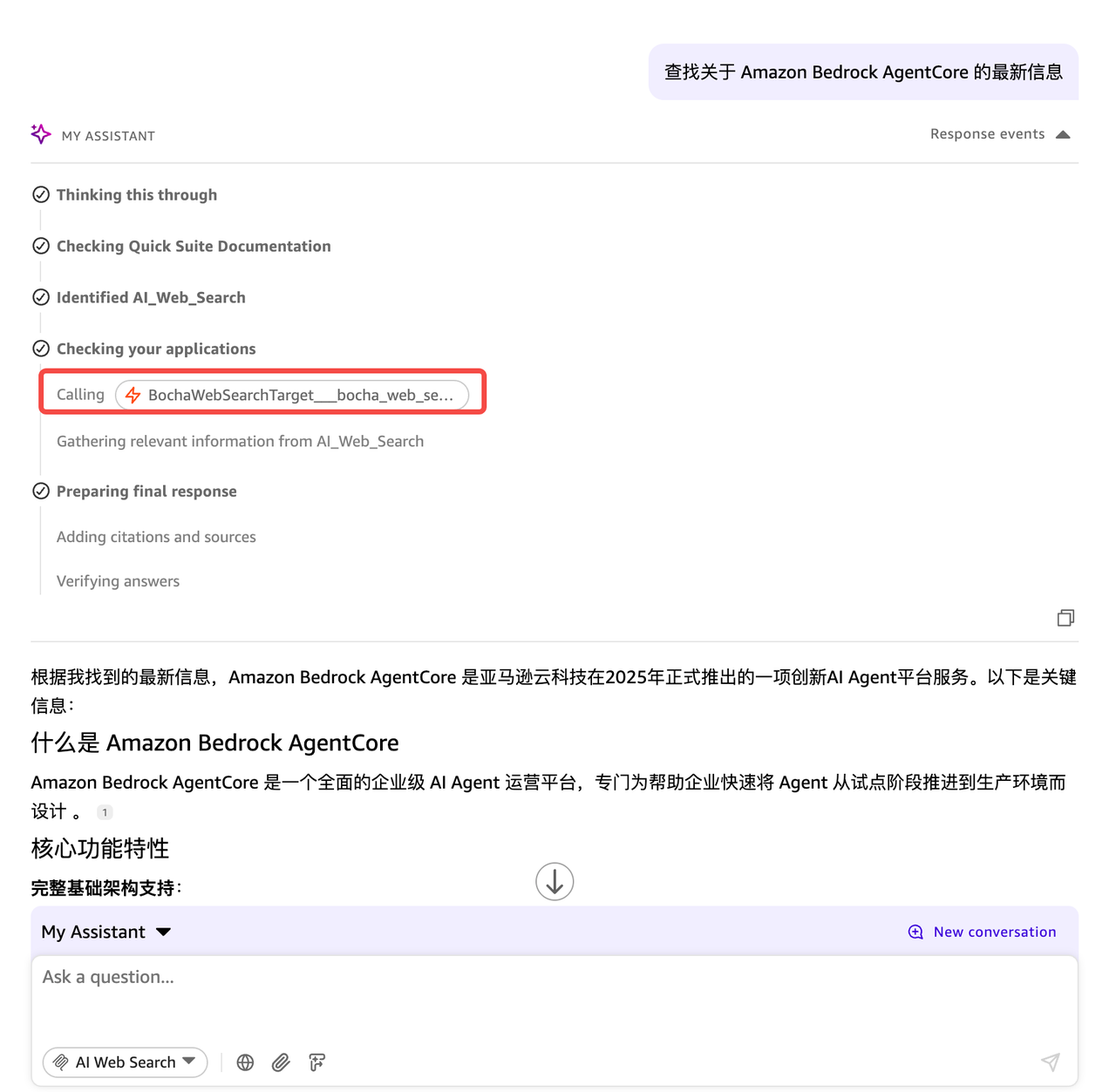 本文展示了如何利用 Amazon Bedrock AgentCore Gateway 和 Model Context Protocol (MCP) 将专业的智能搜索能力集成到 Amazon Quick Suite 中,为企业 AI 工作空间提供强大的信息检索能力。博查搜索提供的多模态混合搜索、秒级内容收录和语义排序能力,为 Quick Suite 的 AI 助手提供了高质量、低时延的信息检索支持。