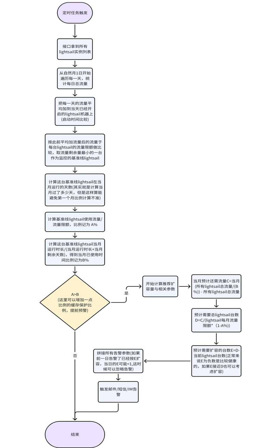 - 自动扩容逻辑:当月运行时长最久实例的剩余流量 x (区域相同lightsail的数量 +扩容数量)= 当月剩余流量池