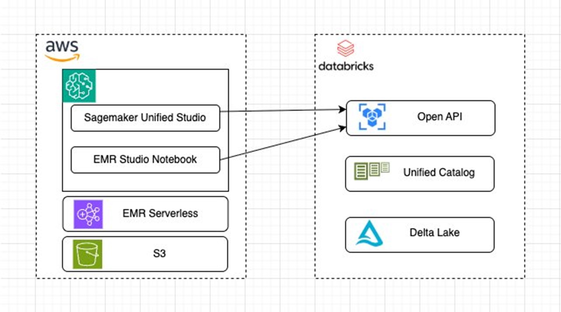 此架构旨在整合 AWS SageMaker Notebook和Databricks Unity Catalog 的功能,以实现高效的数据处理、机器学习模型开发以及跨平台的数据共享和协作。