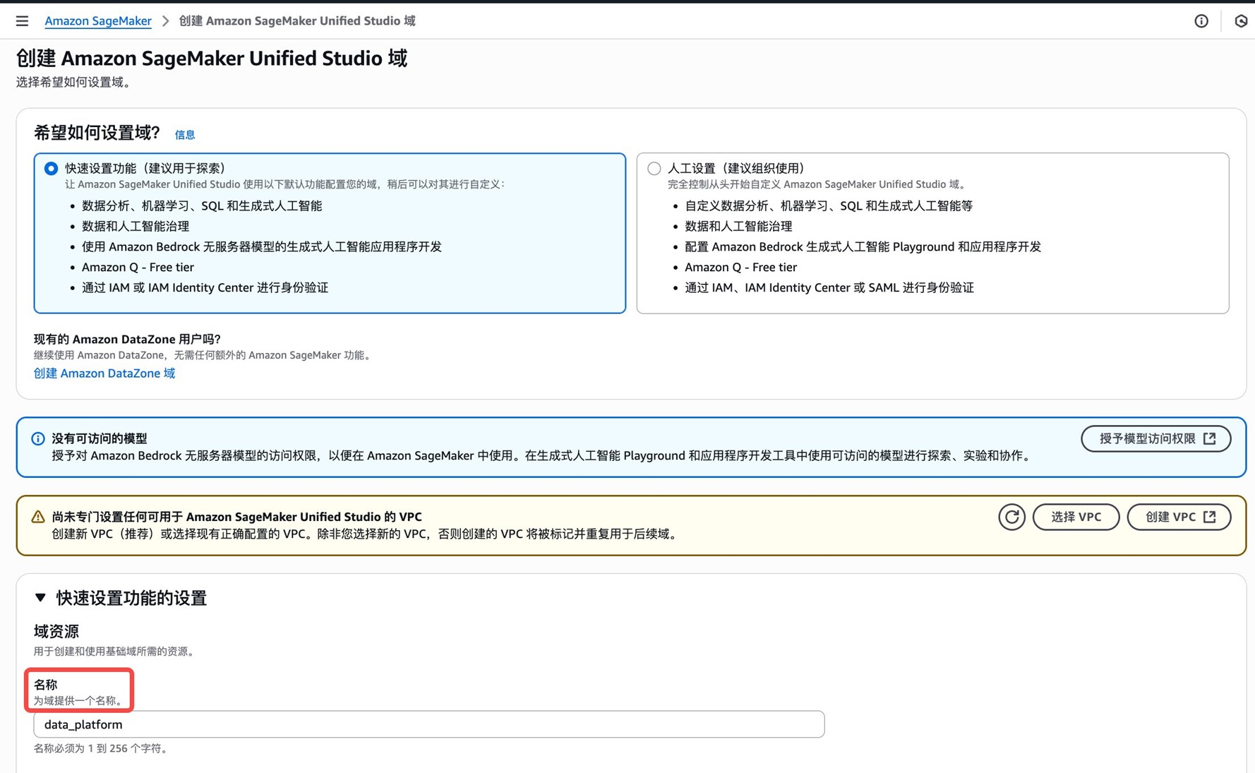 - 要开始创建域,请在 Amazon SageMaker 控制台上点击 创建统一工作室域 按钮。