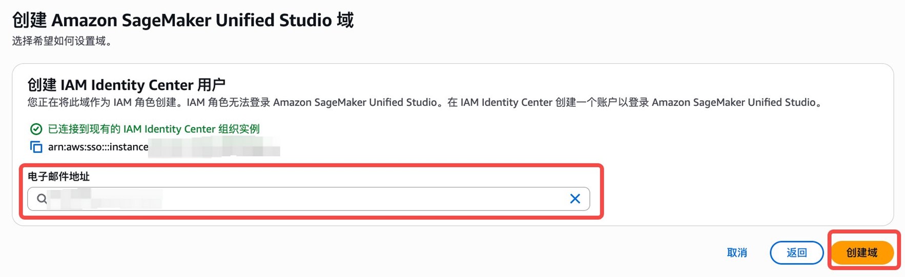 - Amazon SageMaker Unified Studio 域默认支持 IAM 用户身份验证。在此输入IAM Identity Center中用户电子邮箱地址。