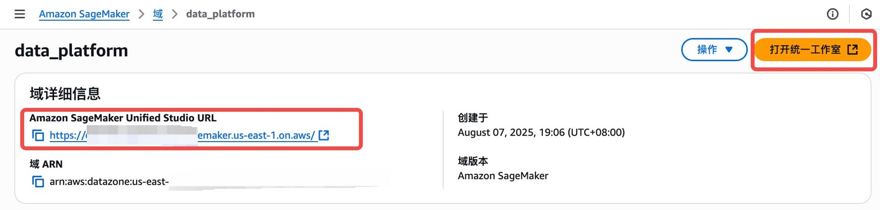 - 创建成功后通过url或者“打开统一工作室”按钮登陆Amazon SageMaker Unified Studio。点击后选择 SSO 方式登陆。输入在IAM 身份中心设置的用户名和密码。