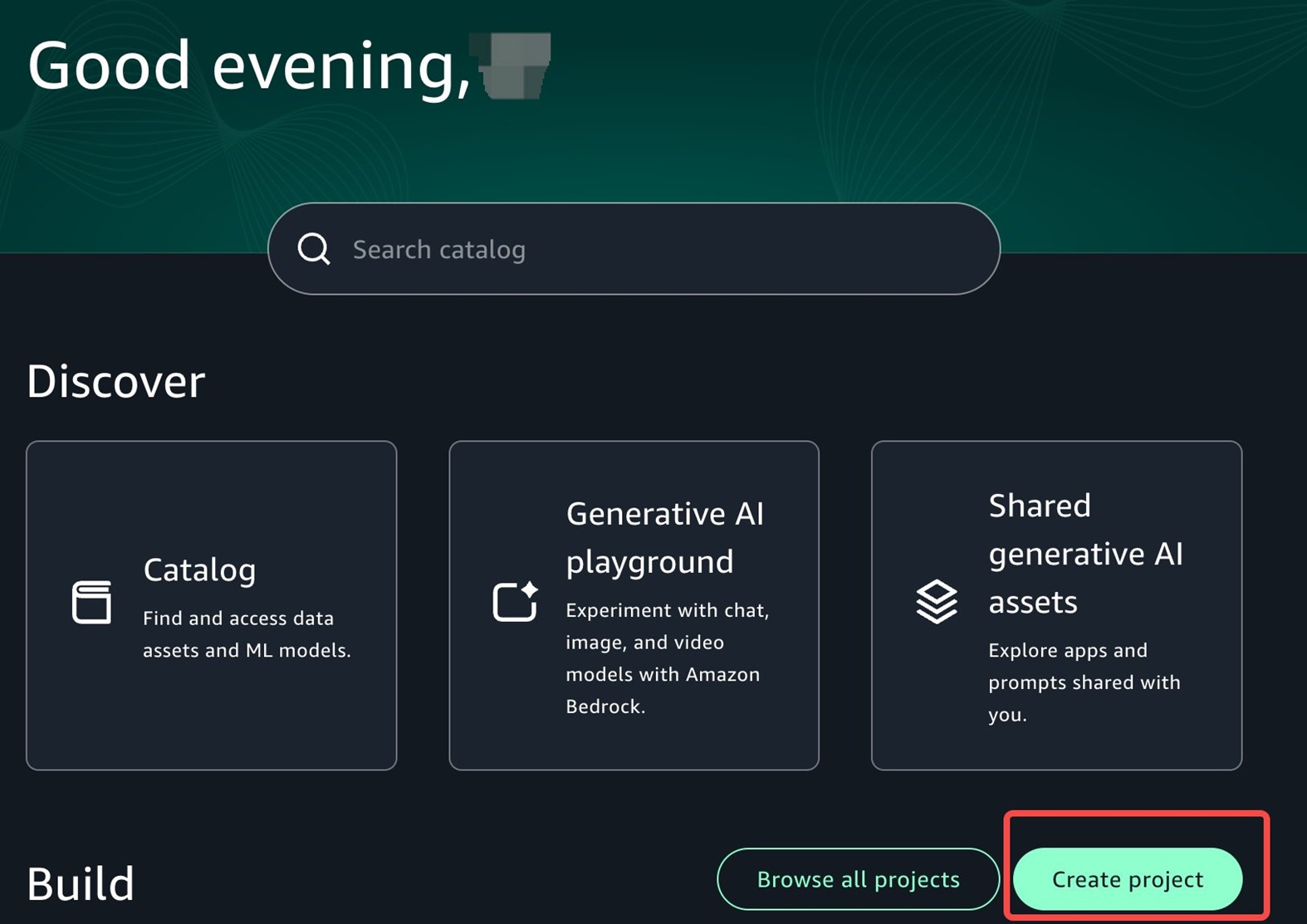- 登陆后点击创建项目,在 Amazon SageMaker Unified Studio 中,通过项目汇集人员、数据和工具,使数据用户群体能够协作解决特定的业务用例。
