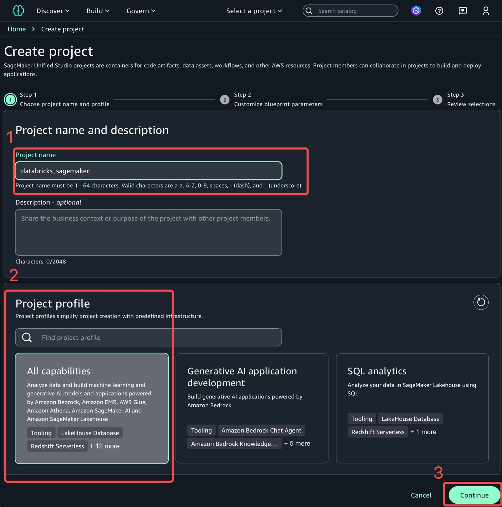 - 修改项目名称,选择合适的项目配置文件。项目配置文件是用于创建项目的配置蓝图的集合。蓝图定义了项目成员在处理 Amazon SageMaker 目录中的数据时可以使用哪些 AWS 工具和服务。这里选择的是所有功能,选择后点击继续。