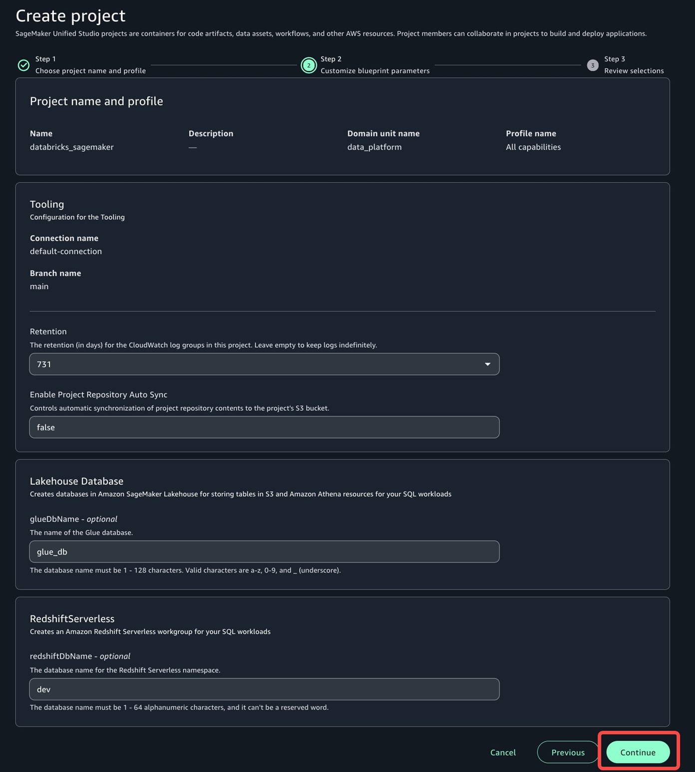 - 可以按需更改日志保留期等配置,由于在此场景下已经禁用了glue catalog,可以忽略lakehouse database中的glue database name更改,这里保持默认设置。点击继续。跳转到下一页后再选择 创建项目。创建成功后,您将被重定向到项目主页。