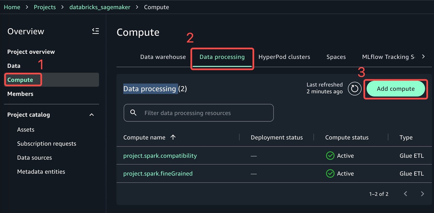- 下一步我们来添加EMR Serverless 计算资源。进入项目后,在左侧概览下选择compute,点击Data processing,点击 add compute。