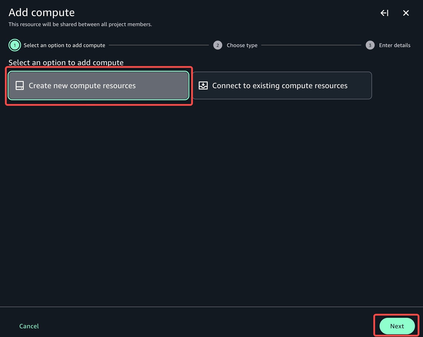 - 您可以选择连接到现有计算资源。如果您为创建资源,可以选择Create new compute resources,点击 next
