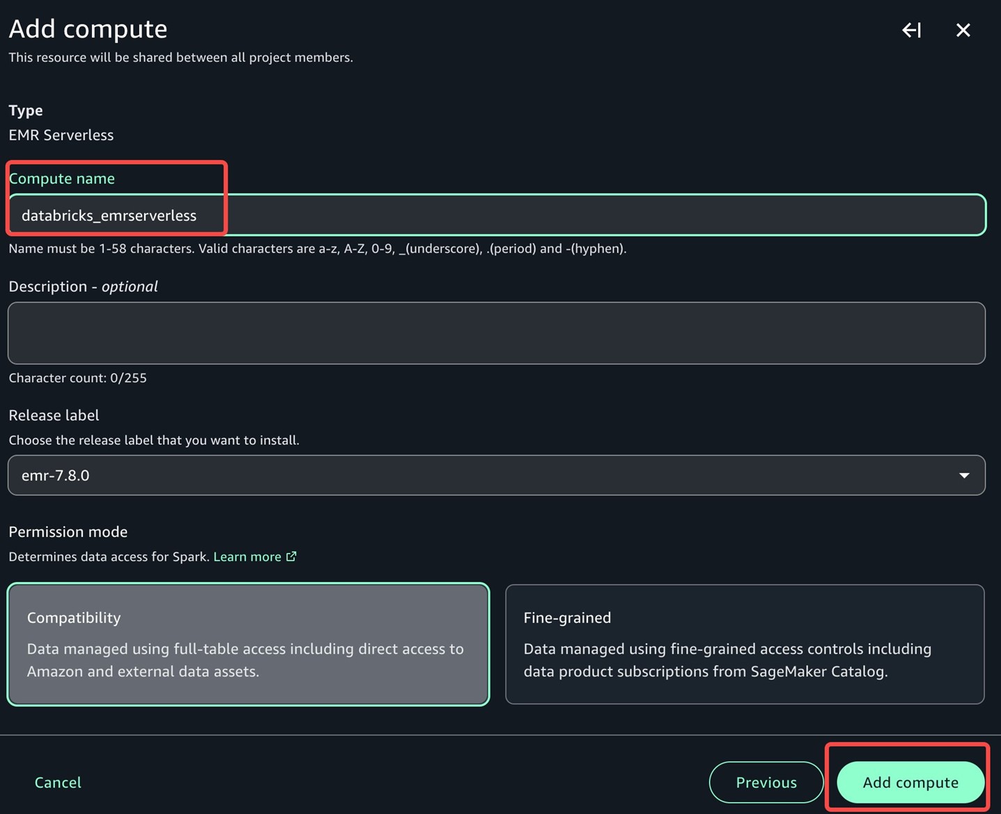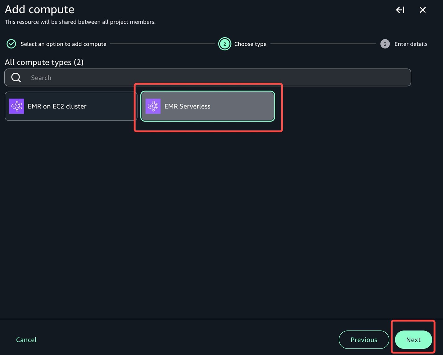 - 关于计算资源种类,我们选择EMR Serverless , 点击 next,修改compute name,其他保持默认值,点击 add compute