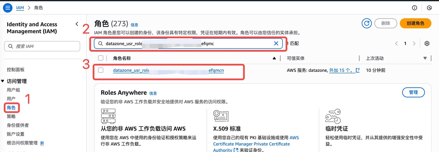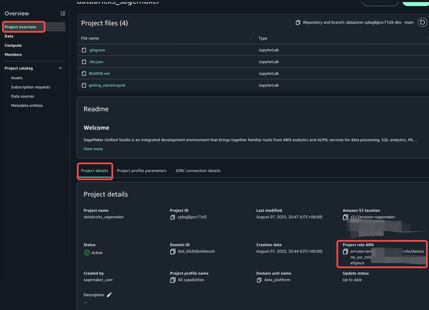 - 我们先在左侧概览下选择Project overview,在Project details找到Porject role arn,从 datazone_user字段开始复制