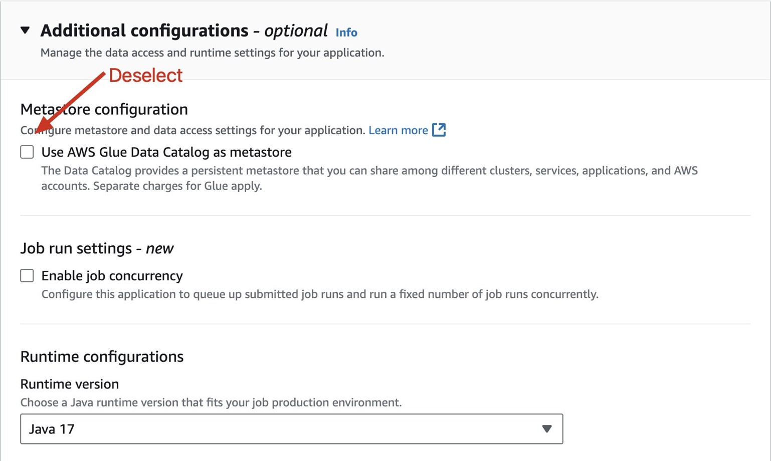 下面我们需要修改 EMR Serverless Application 的配置, 为了保证后面我们在 Sagemaker Unified Studio 中的配置一致,我们需要修改Application的 Application configuration 和 Additional configurations. 修改的内容如下