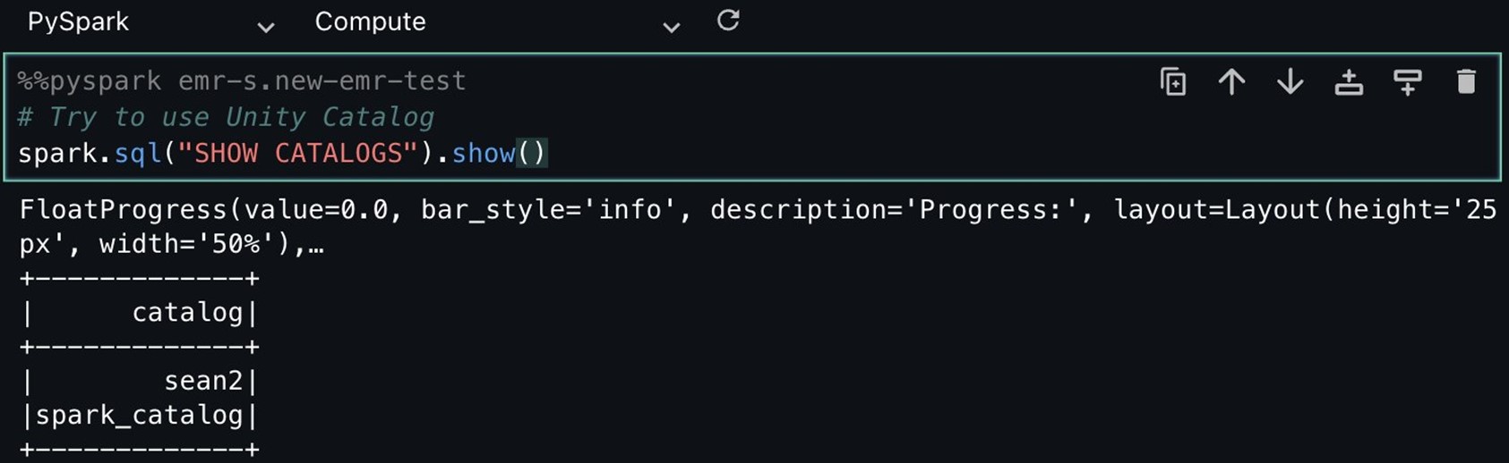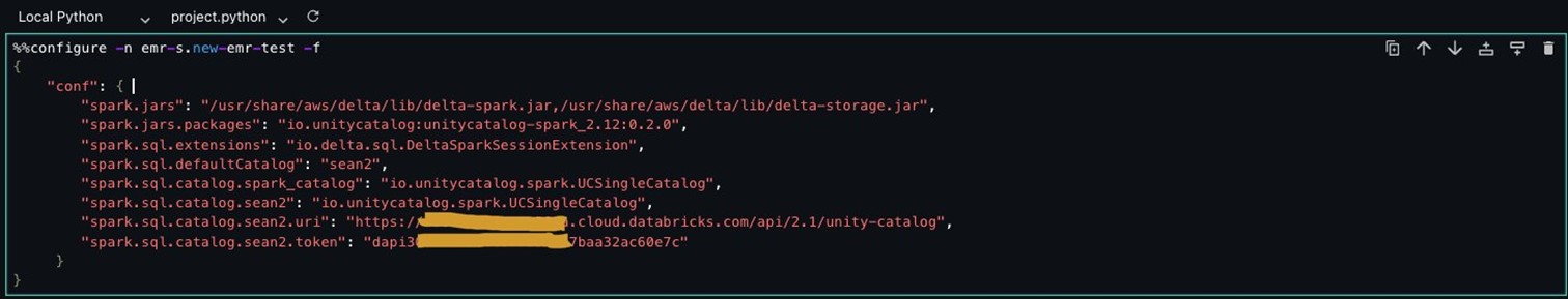 在我们创建Sagemaker Unified Studio的时候,会默认选上Glue Catalog作为Catalog的默认选项,如何我们想在Notebook内使用Databricks Unified Catalog, 我们需要覆盖原有Glue Catalog配置信息,注意下面的catalog信息.