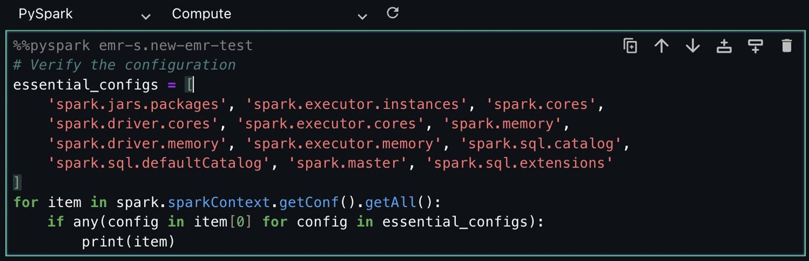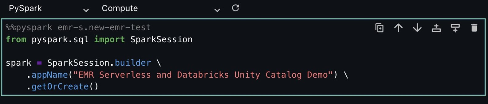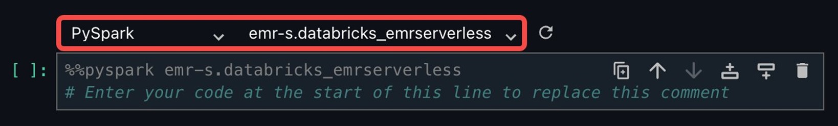 如果想使用emr serverless计算资源,请在每个单元格上方进行选择,左侧选择pyspark,右侧选择创建好的emr serverless资源