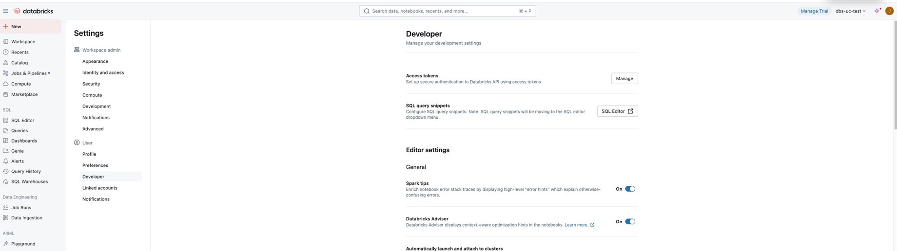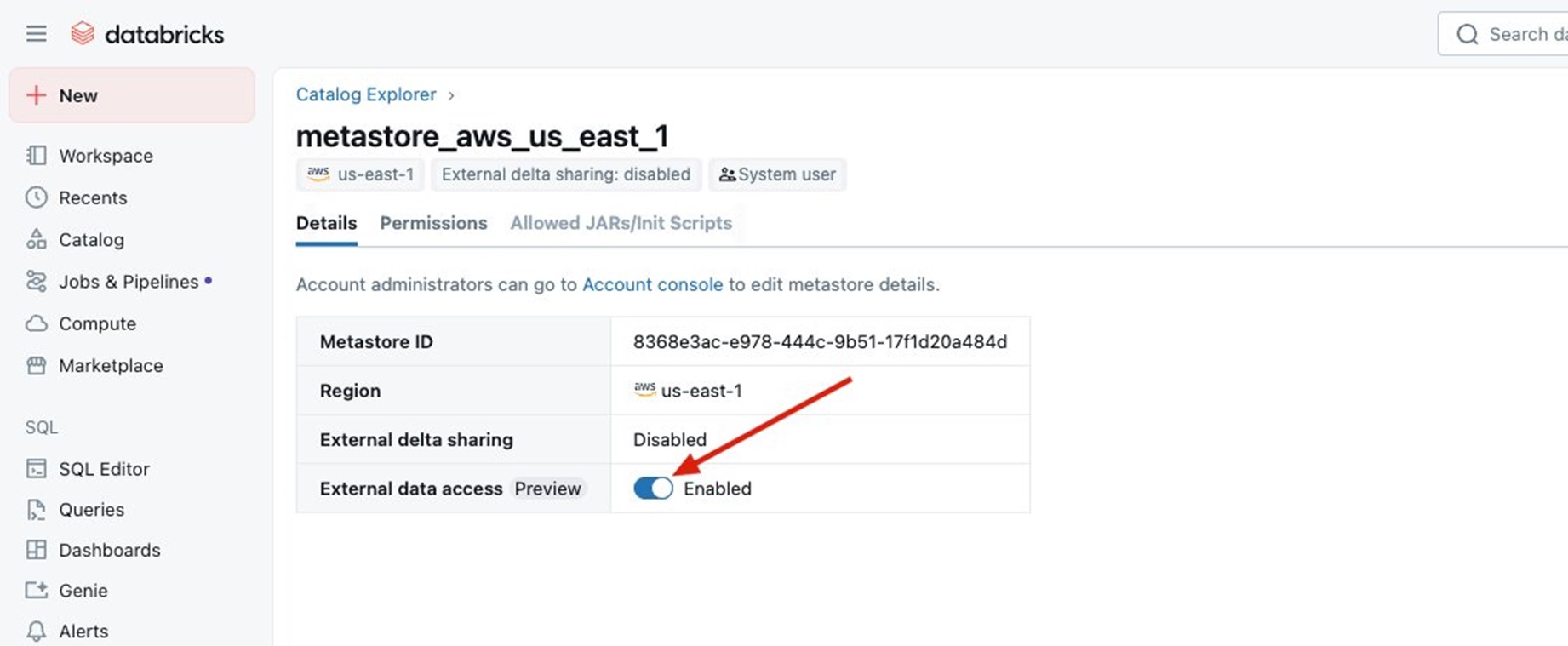 - 首先我们需要开启Databricks的Catalog External Access, 配置步骤如下.