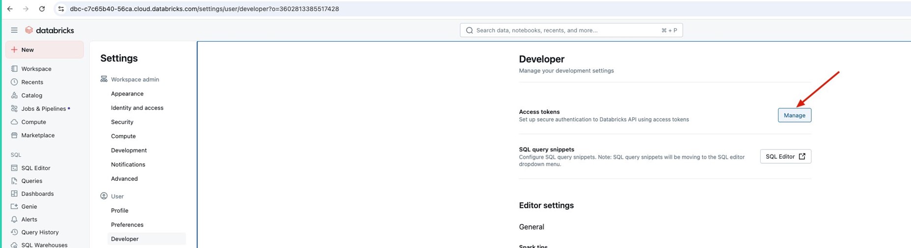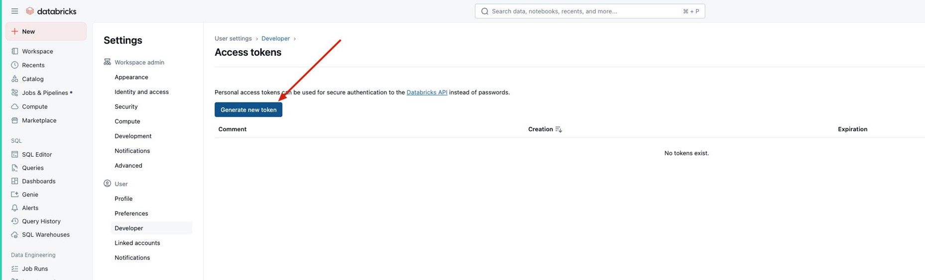 - 配置对用Databricks 用户Personal Access Token,点击用户Settings 选项