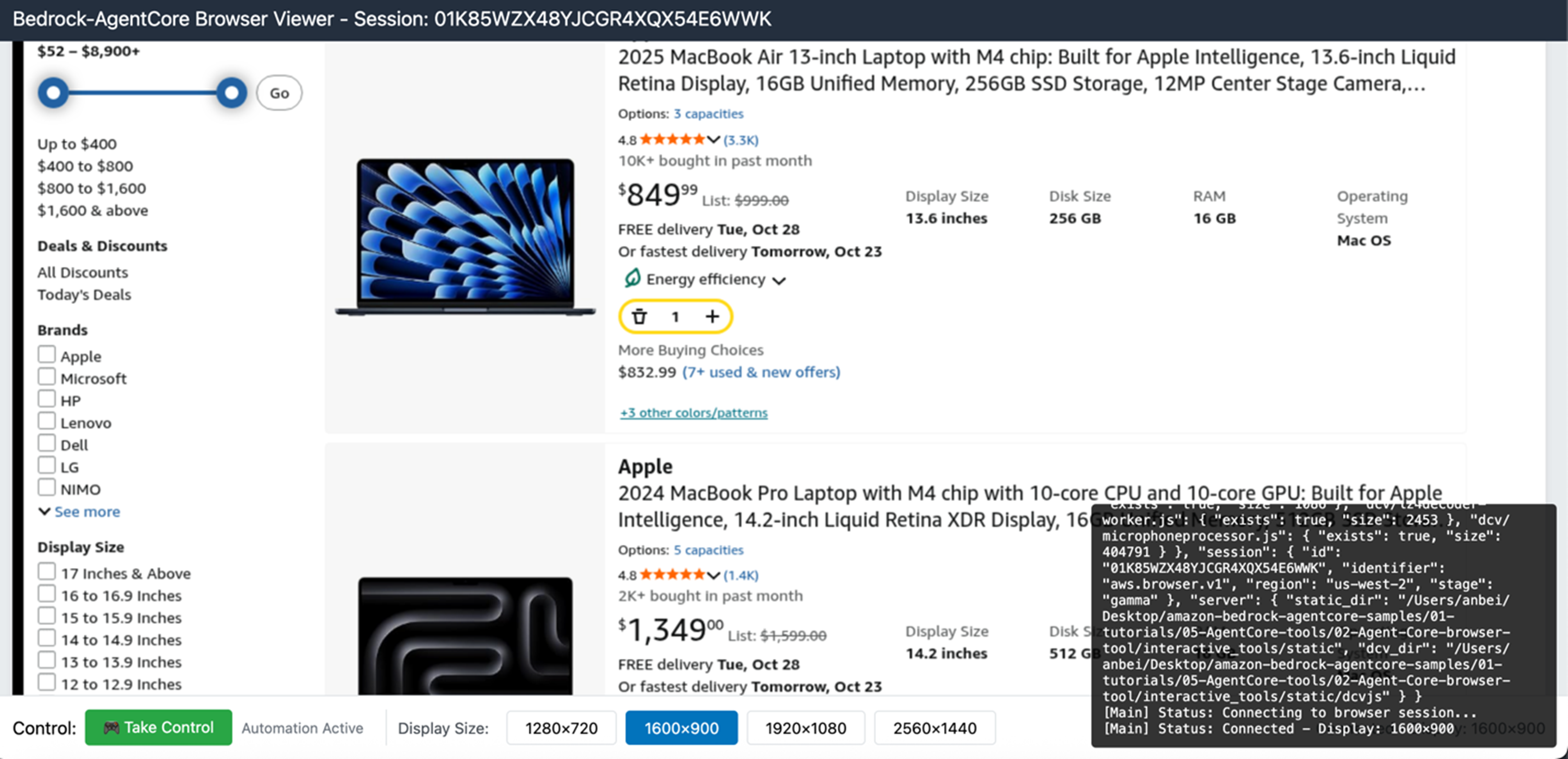 ⠏ Running browser automation...INFO [BrowserSession] ⌨️ Typed "MacBook" into element with index 9